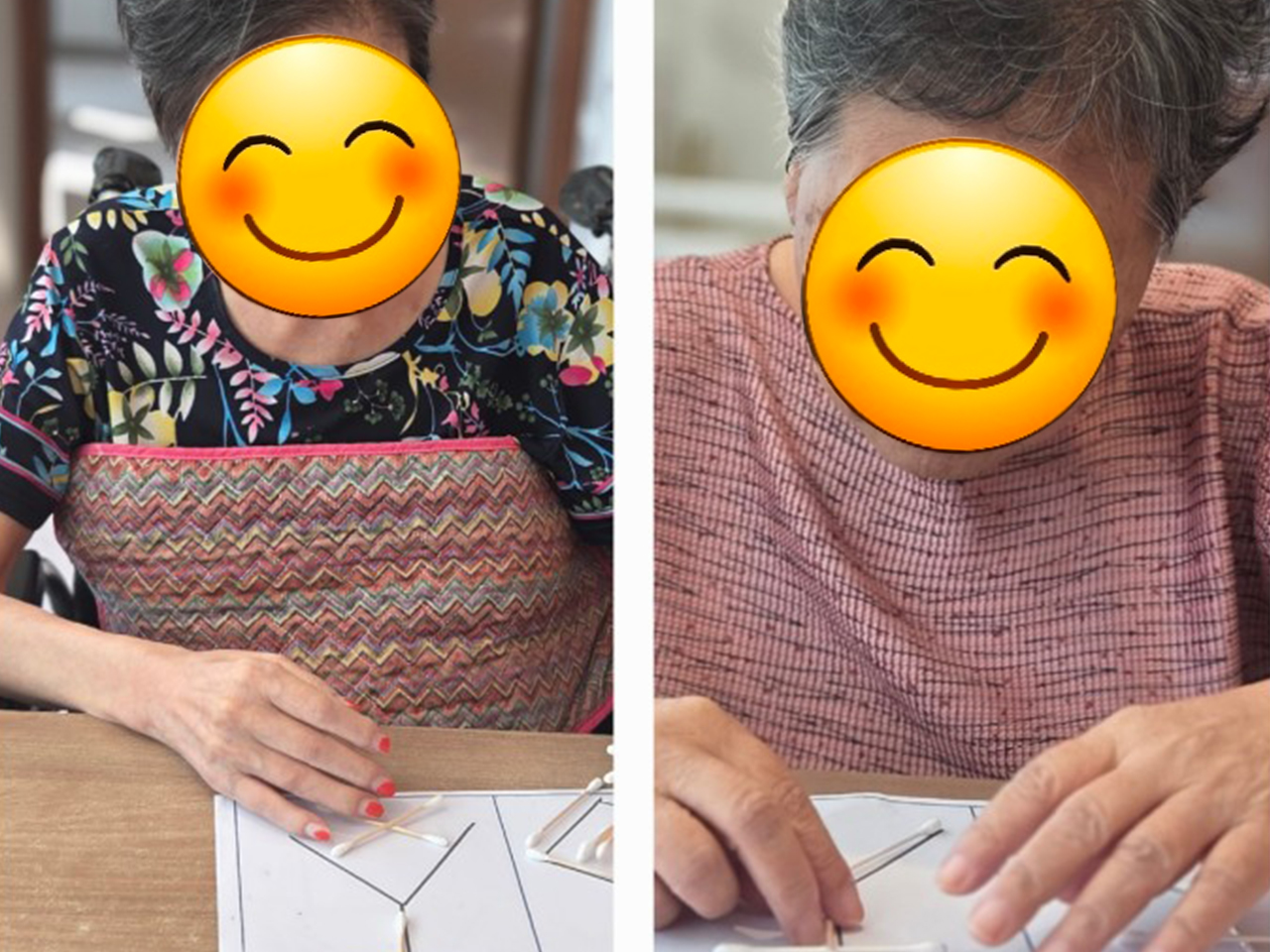 선에 맞추어 면봉을 놓으시고 끝까지 잘 마무리 하시면 칭찬해 드리니 흐뭇해 하시며 기뻐하셨습니다.
